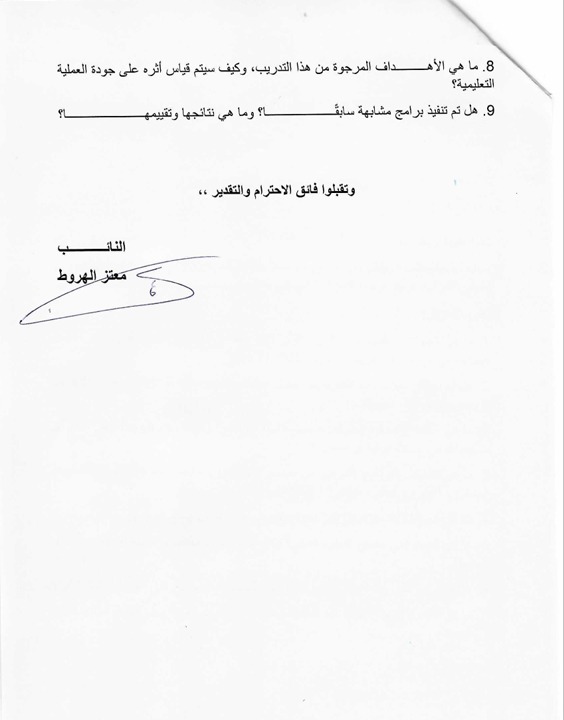 كما تساءل عن أي التزامات مالية قد تترتب على المعلمين المشاركين، والجدول الزمني لتنفيذ المشروع وموعد الانتهاء منه، إلى جانب الأهداف المرجوة من البرنامج وآليات قياس أثره على جودة العملية التعليمية.