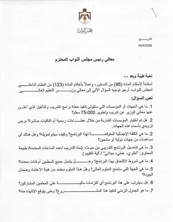 وتناول السؤال تفاصيل البرنامج الذي أعلن عنه لتدريب وتطوير نحو 75 ألف معلم، حيث استفسر الهروط عن الجهات أو المؤسسات التي ستتولى تنفيذ هذا البرنامج، وآلية اختيارها، وما إذا كان ذلك سيتم عبر عطاءات رسمية أو اتفاقيات مباشرة.
