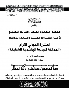 قدم المستشار في الديوان الاميري الكويتي والسفير الكويتي في الاردن سابقا الشيخ فيصل الحمود الفيصل المالك الصباح أحر مشاعر التعازي القلبية وصادق المواساة لعشيرة المجالي الكرام بوفاة المرحومة رمزية شعبان ياخوت أرملة المرحوم عبد الهادي باشا المجالي داعيا الله العلي القدير ان يتغمد الفقيدة بواسع رحمته وأن يسكنها فسيح جناته وأن يلهم أهلها وذويها الصبر والسلوان ..