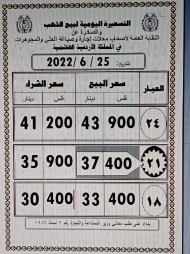 وبلغ سعر بيع غرام الذهب عيار 21 الأكثر رغبة لدى المواطنين في السوق المحلية، عند 37.40 دينارا لغايات الشراء من محلات الصاغة، مقابل 35.90 دينارا لجهة البيع، وسط طلب متوسط.