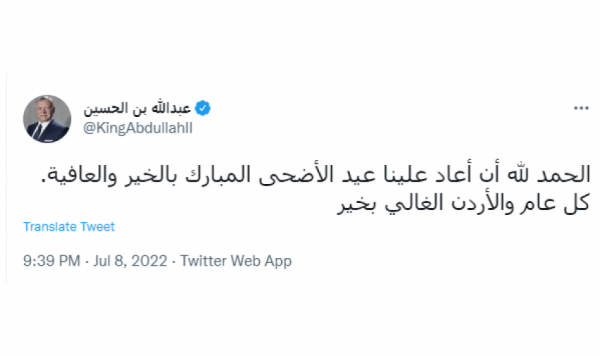 وقال جلالته، في تغريدة له عبر منصة تويتر، "الحمد لله أن أعاد علينا عيد الأضحى المبارك بالخير والعافية. كل عام والأردن الغالي بخير".