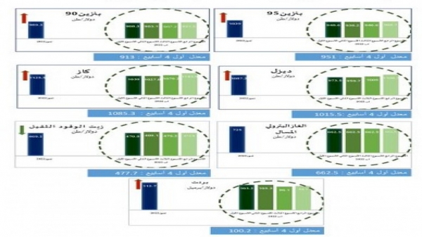 وارتفع سعر الديزل من 1009 دولارات للطن إلى 1108.7 دولار وبنسبة ارتفاع بلغت 9.9%، وارتفع سعر الكاز من 1079.2 دولارا للطن إلى 1183.9 دولارا وبنسبة ارتفاع بلغت 9.7%، في حين انخفض سعر زيت الوقود من 479.2 دولارا للطن إلى 473.9 دولارا وبنسبة انخفاض بلغت 1.1%.