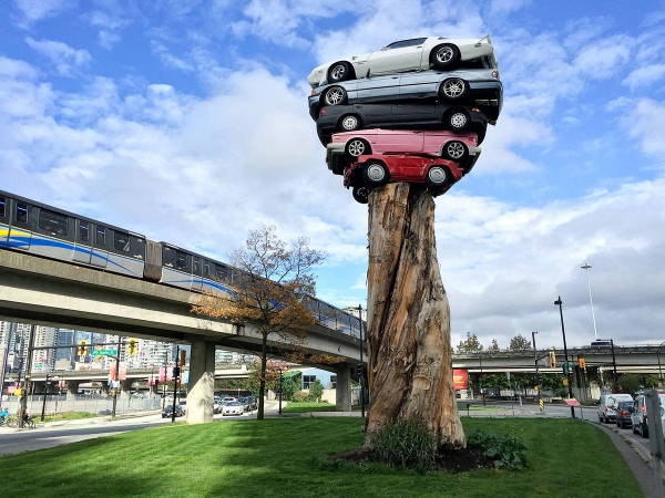 وماذا لو رأيت شجرة شاهقة تحمل اعلاها خمس سيارات كلاسيكية تشكل ركنها الاساس في مدينة فانكوفر الكندية؟ منظر يستحق القيام بجولة لتمتيع النظر به، فمن هو ملم بعالم السيارات سيدرك شعورنا عندما نصف هيبة هذه اللوحة التي اطلق عليها اسم ترانس ام توتم (Trans Am Totem) وصممت خصيصا لترضي ذوق عشاق الفن والاليات سواء. فالسيارات هنا كتبت لها صفحة جديدة لتصبح هي النجمة اللافتة للأنظار بالرغم من توقفها عن العمل.