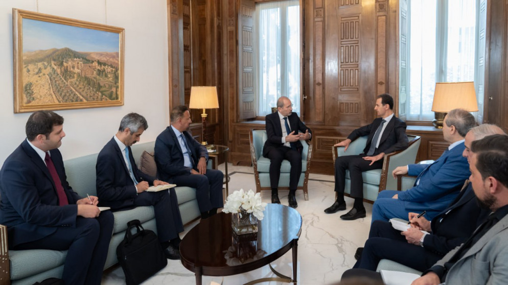 التقى نائب رئيس الوزراء وزير الخارجية وشؤون المغتربين، أيمن الصفدي، الاثنين، الرئيس السوري بشار الأسد في دمشق، وبحثا "ملف عودة اللاجئين السوريين والعلاقات الثنائية" بين البلدين، بحسب وكالة الأنباء السورية "سانا".