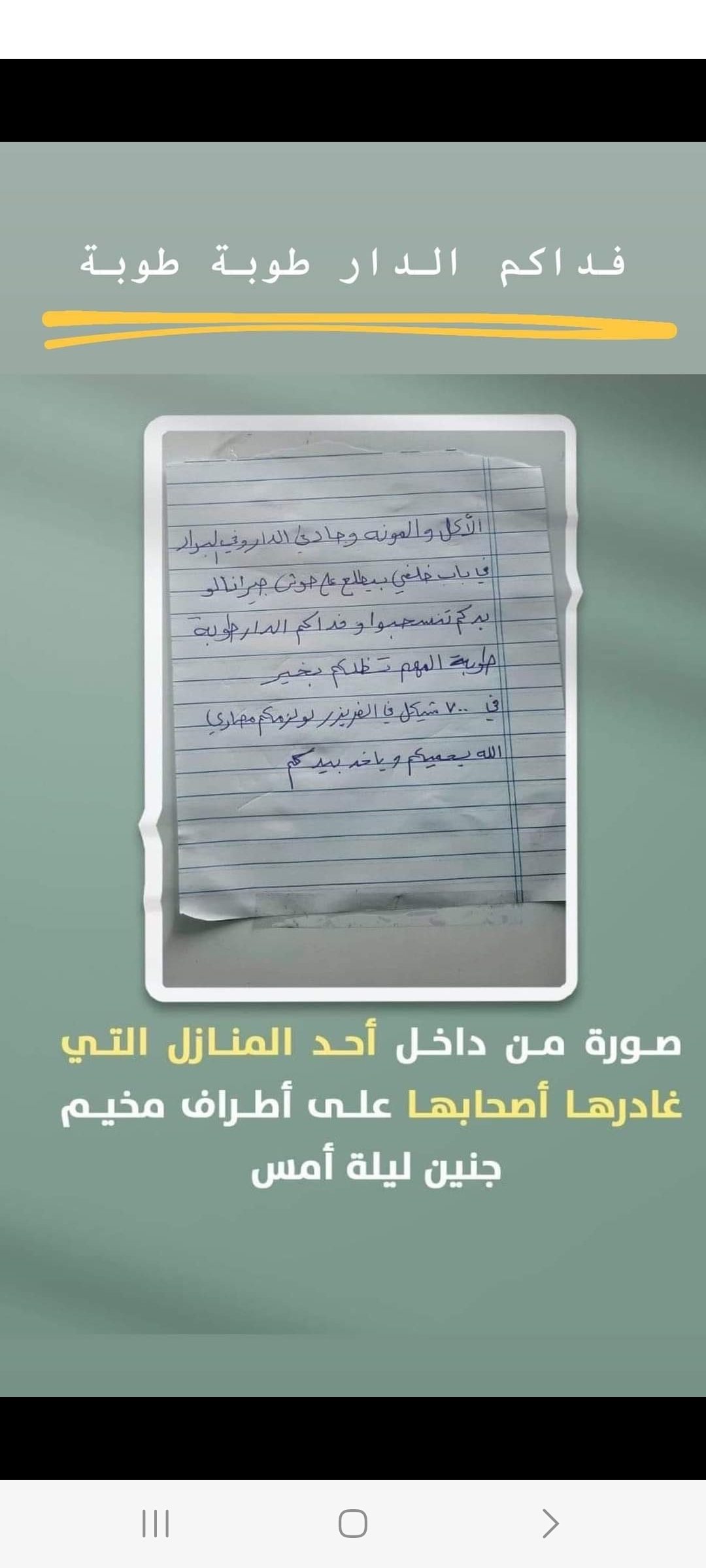 ترك مواطن من مواطني مخيم جنين رسالة مؤثرة للمقاومين في المخيم في حالة دخولهم إلى منزله للتخفي من ملاحقة قوات الإحتلال الصهيوني قال فيها :