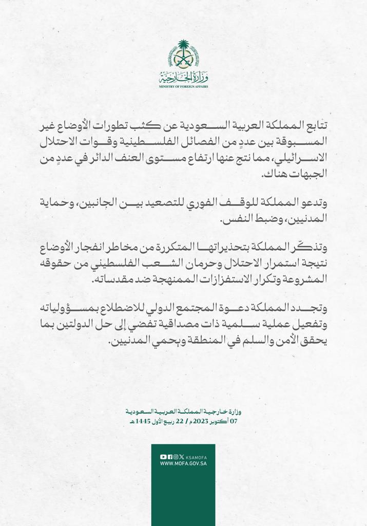 وتذكر السعودية بتحذيراتها المتكررة من مخاطر انفجار الأوضاع نتيجة استمرار الاحتلال وحرمان الشعب الفلسطيني من حقوقه المشروعة وتكرار الاستفزازات الممنهجة ضد مقدساته.