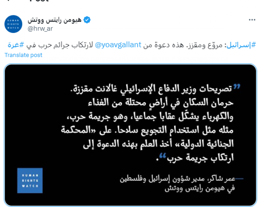 هيومن رايتس ووتش: تصريحات غالانت "مقززة" ومروعة