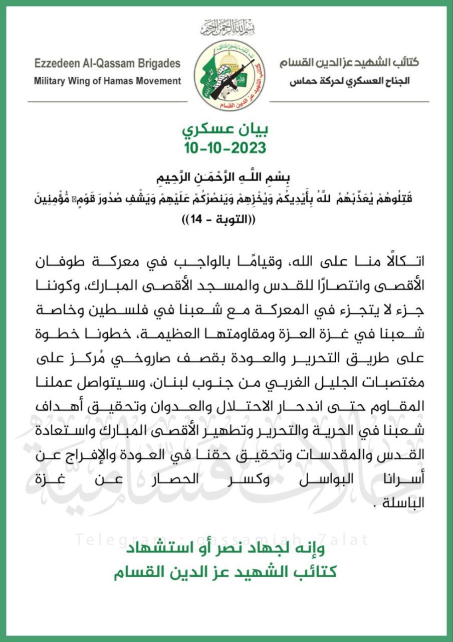 وأفادت الكتائب في بيانها "اتكالا منا على الله، وقياما بالواجب في معركة طوفان الأقصى وانتصارا للقدس والمسجد الأقصى المبارك وكوننا جزء لا يتجزء في المعركة مع شعبنا في فلسطين وخاصة شعبنا في غزة العزة ومقاومتها العظيمة، خطونا خطوة على طريق التحرير والعودة بقصف صاروخي مركز على مغتصبات الجليل الغربي من جنوب لبنان".