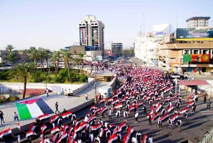 واحتشد العراقيون المتظاهرون في ساحة التحرير لإقامة الصلاة الموحدة والتظاهر نصرة للقضية الفلسطينية.