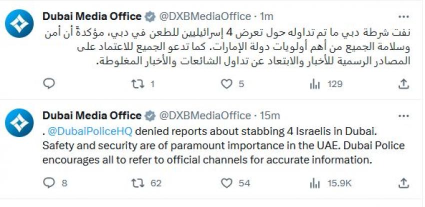 الراي نيوز  - نفت شرطة دبي الأنباء والتقارير التي تحدثت عن طعن 4 اسرائيليين في دبي، مؤكدة ان السلامة والأمن ذات أهمية قصوى في دولة الإمارات.