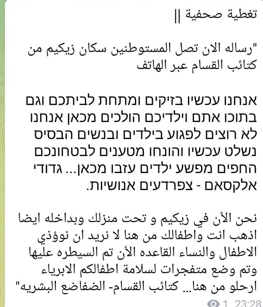 وتناقل مستوطنون، صورًا لمكالمات ورسائل تلقوها مما ادّعوا أنّها أرقام لكتائب القسّام، فتناقلوا رسالة تقول بالعبريّة: "نحن الآن في زيكيم وتحت منزلك وداخله أيضًا. اذهب أنت وأطفالك من هنا. لا نريد أن نؤذي الأطفال والنساء. تم الآن السيطرة على القاعدة ووضع المتفجرات للسلامة من أطفالكم الأبرياء اخرجوا من هنا... كتائب القسام الضفادع البشرية".