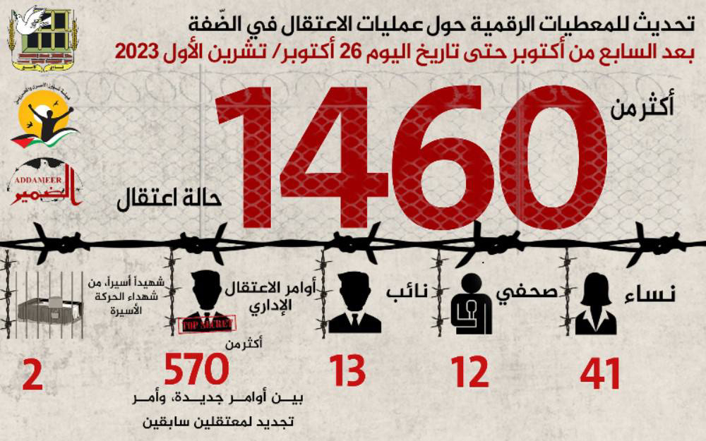 أكثر من 1460 حالة اعتقال بين الفلسطينيين منذ 7 تشرين الأول