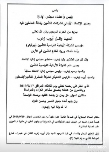 انتقل الى رحمة الله تعالى عصر اليوم الثلاثاء رجل الاعمال الاردني والاقتصادي الكبير شيخ التامين وائل زعرب ابو الوليد .