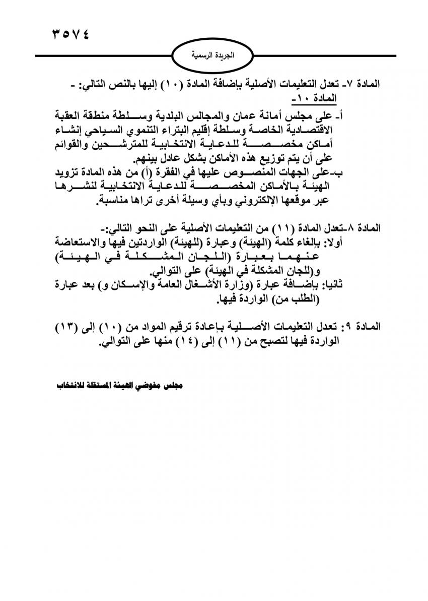 الراي نيوز - ألزمت التعليمات المعدلة للتعليمات التنفيذية الخاصة بقواعد حملات الدعاية الانتخابية لسنة 2024، الصادرة في الجريدة الرسمية اليوم الثلاثاء، مجلس أمانة عمان الكبرى ومجالس البلديات وسلطة منطقة العقبة الإقتصادية الخاصة وسلطة إقليم البترا التنموي السياحي، إنشاء أماكن مخصصة للدعاية الإنتخابية للمرشحين والقوائم.