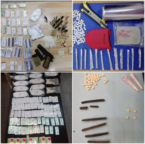وعن باقي محافظات المملكة فقد ضبطت كوادر إدارة مكافحة المخدرات حقيبة بداخلها١٥ ألف حبة من حبوب الكبتاجون المخدرة أخفيت في أحدى المناطق الخالية شرق مخيم الزعتري في محافظة المفرق فيما زال البحث جارياً عن المتورطين بإخفائها ، كما وألقي القبض في ذات المحافظة على أحد المروجين بعد مداهمة منزله وبحوزته نص كف من مادة الحشيش و ٥٠ حبة كبتاجون وسلاح ناري.