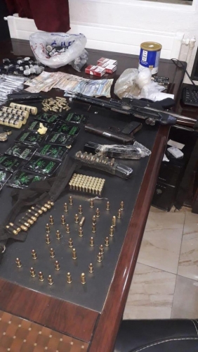 داهمت قوة أمنية من مديرية شرطة محافظة اربد منزل أحد المطلوبين في قرية سمر بمحافظة اربد والقت القبض عليه وضبطت بحوزته سلاحين ناريين وكمية من المواد المخدرة.