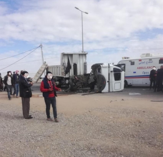 ذكرت إدارة الإعلام في الدفاع المدني أن كوادر الإنقاذ والإسعاف في مديرية دفاع مدني الكرك وبإسناد من مديرية إنقاذ وإسناد الجنوب تعاملت مع حادث تصادم بين قلاب وحافلة ركاب ومركبتين على الطريق الصحراوي بالقرب من مثلث الأبيض , حيث نتج عن الحادث إصابة (68) شخص بجروح ورضوض في مختلف أنحاء الجسم.
