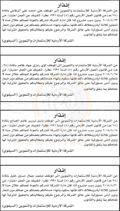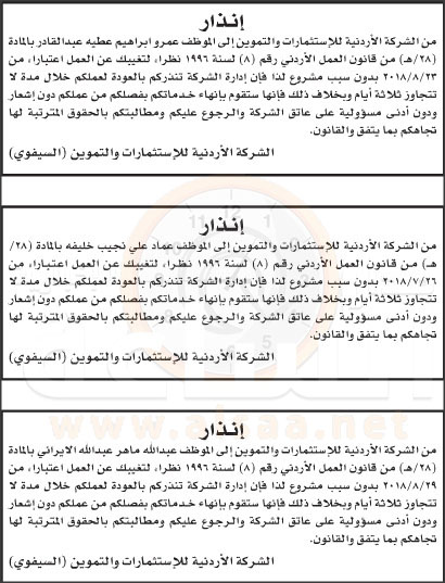 - وجهت الشركة الاردنية للاستثمارات والتموين (السيفوي) إنذارات لعدد من الموظفين، نظراً لتغيبهم عن العمل بدون سبب مشروع.