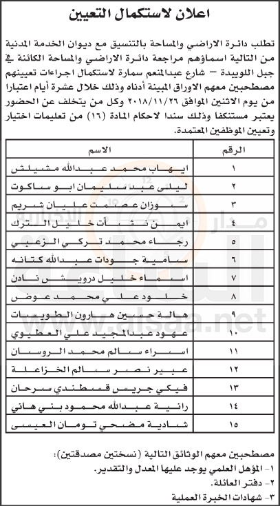 مدعوون للتعيين في ’الأراضي والمساحة‘ (أسماء)