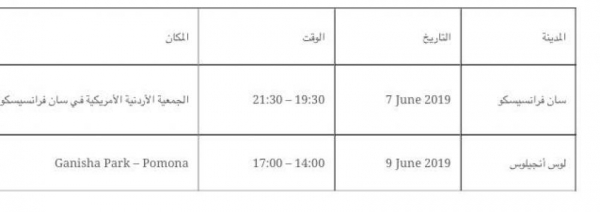 اعلنت السفارة الاردنية في واشنطن عن زيارة لفريق عمل الى مدينتي سان فرانسيسكو ولوس أنجيلوس وذلك في إطار تعزيز التواصل بين السفارة والأردنيين المقيمين في الولايات المتحدة الأمريكية.