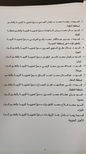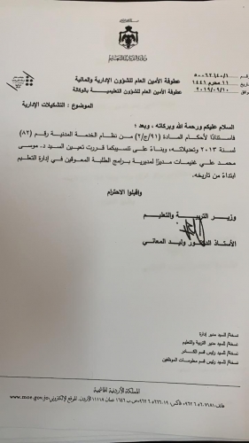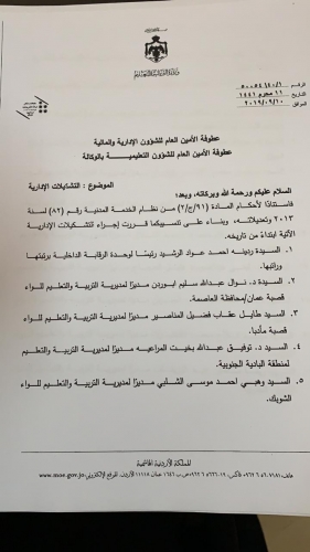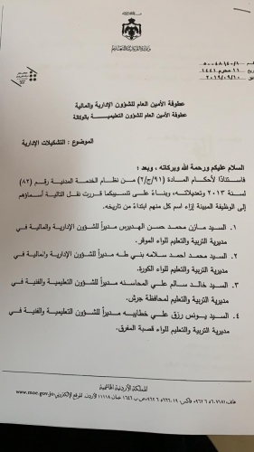 قرر وزير التربية والتعليم الدكتور وليد المعاني اجراء تنقلات ادارية في التربية على النحو التالي: