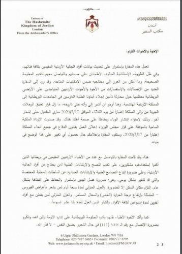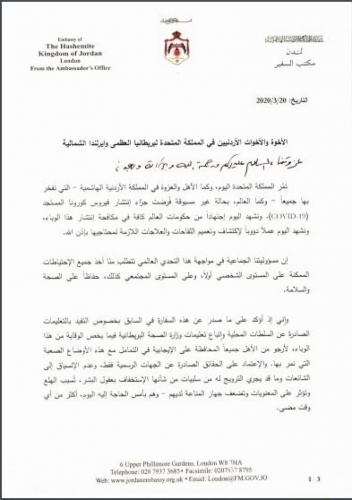 وذكرت السفارة الاردنية في لندن في بيان لها، ان السفير اكد في رسالته، ان مسؤوليتنا الجماعية في مواجهه هذا التحدي المتمثل بفيروس كورونا العالمي، تتطلب منا اخذ الاحتياطات الممكنة على المستوى الشخصي وعلى المستوى المجتمعي، حفاظا على الصحة والسلامة العامة.