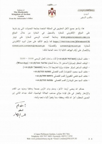 كما دعا الاردنيين الى متابعة التحديثات المستمرة على موقع السفارة الالكتروني: Www.jordanembassy.org.uk وحسابات السفارة على مواقع التواصل الاجتماعي والبريد الالكتروني للسفارة والقنصلية: London@fm.giv.jo، Consulate.london@fm.gov.jo.