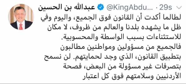 وقال جلالته في تغريدة على (تويتر) مساء اليوم الثلاثاء "لطالما أكدت أن القانون فوق الجميع، واليوم وفي ظل ما يشهده بلدنا والعالم من ظروف، لا مكان للاستثناءات بسبب الواسطة والمحسوبية. فالجميع من مسؤولين ومواطنين مطالبون بتطبيق القانون، الذي وجد لحمايتهم. لن نسمح بتصرفات غير مسؤولة من البعض، فصحة الأردنيين وسلامتهم فوق كل اعتبار".