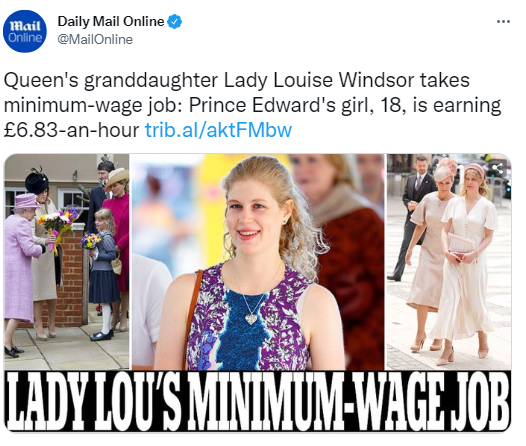 الرأي نيوز - كشف تقرير لصحيفة "ديلى ميل" البريطانية، أن حفيدة الملكة إليزابيث الثانية، لويز وندسور، كانت تعمل عدة أيام في الأسبوع في مركز الحدائق خلال فصل الصيف مقابل الحد الأدنى للأجور، وكانت ابنة الأمير إدوارد وصوفى، كونتيسة ويسيكس، البالغة من العمر 18 عامًا، تكسب 6.63 جنيهًا إسترلينيًا في الساعة منذ الانتهاء من المستويات A فى يونيو، وذلك على الرغم من أنها تعيش في قصر قيمته 30 مليون جنيه إسترليني في باجشوت بارك.
