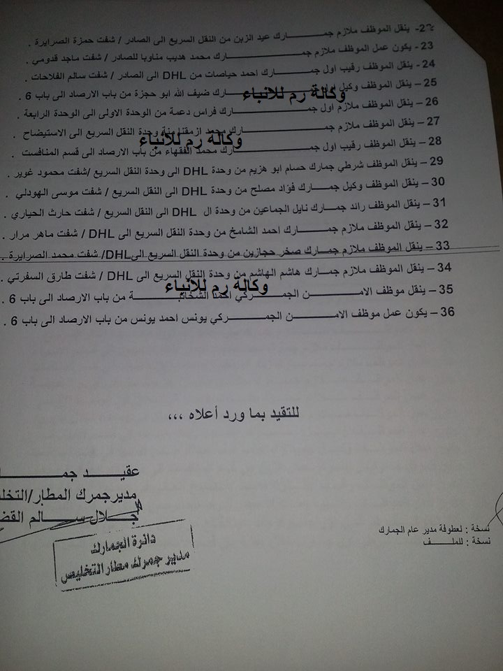 - وصلت الراي نيوز شكوى من موظفين في مطار التخليص قالوا خلالها ان مدير مركز مطار الشحن اجرى تنقلات جمركية واسعة النطاق بين ضباط و ضباط صف الجمارك كانت محصلتها إحكام سيطرة مجموعة معينه ومن منطقة جغرافية واحدة على مواقع القرار في المركز حيث اصبح مدير المركز و مساعده لشؤون القيمة و التخمين رؤساء الوحدات الرئيسية و رئيس المنافيست و رئيس قسم المعاينة و رئيس وحدة الحرة المطار من منطقة جغرافيه واحدة.