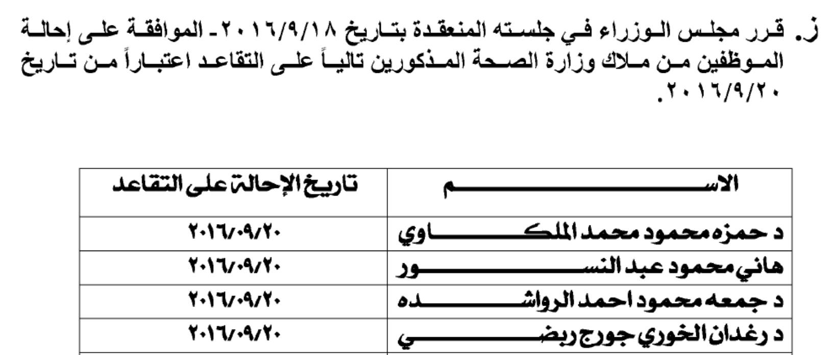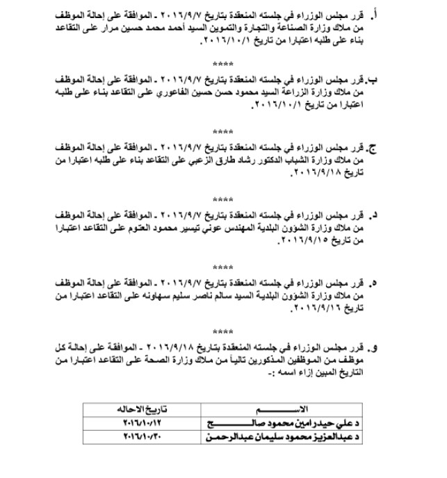 و جاء قرارات الإحالة الى التقاعد بناءاً على بلوغ عدد منهم سن التقاعد القانوني، و أخرين بناءاً على طلبهم و هم التالية اسماؤهم :