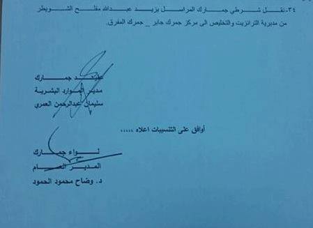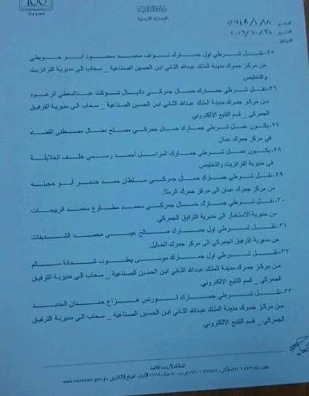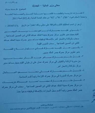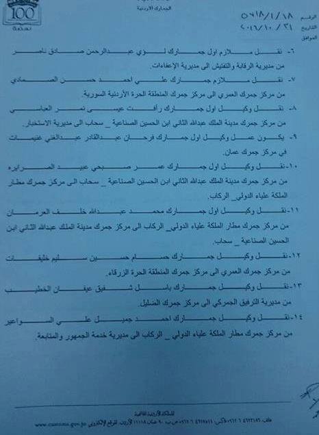 قرر مدير عام الجمارك الأردنية لواء جمارك الدكتور وضاح الحمود، اجراء تنقلات ادارية شملت رتبة عقيد ومقدم ورائد ونقيب وملازم ووكيل وشرطي اعتبار من تاريخ 1 / 11 / 2016.