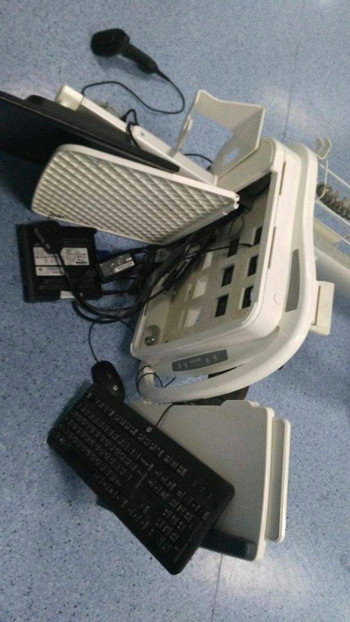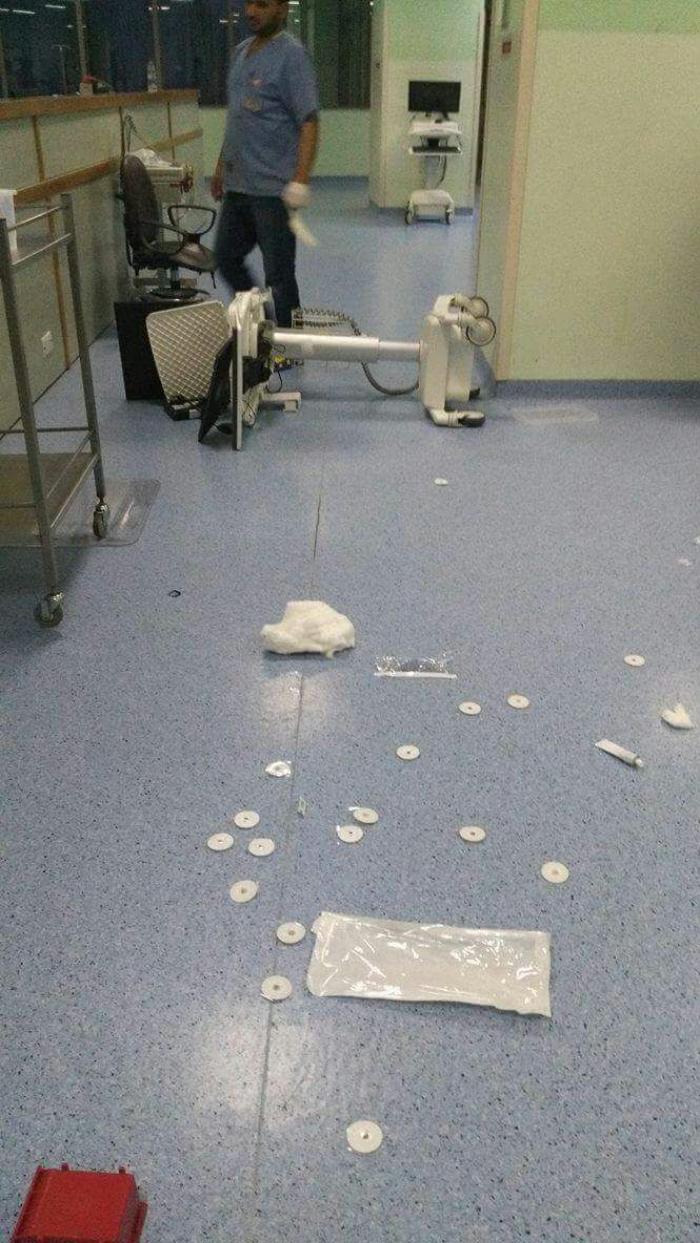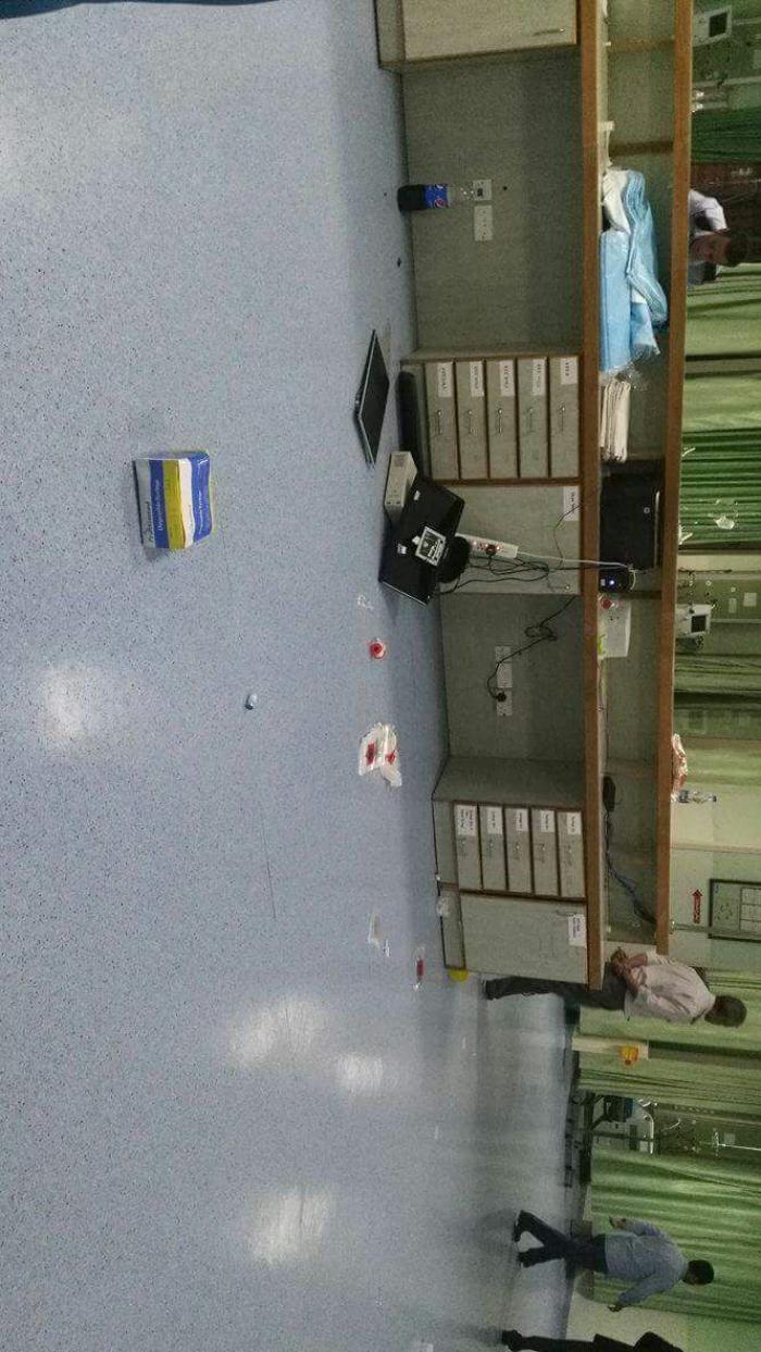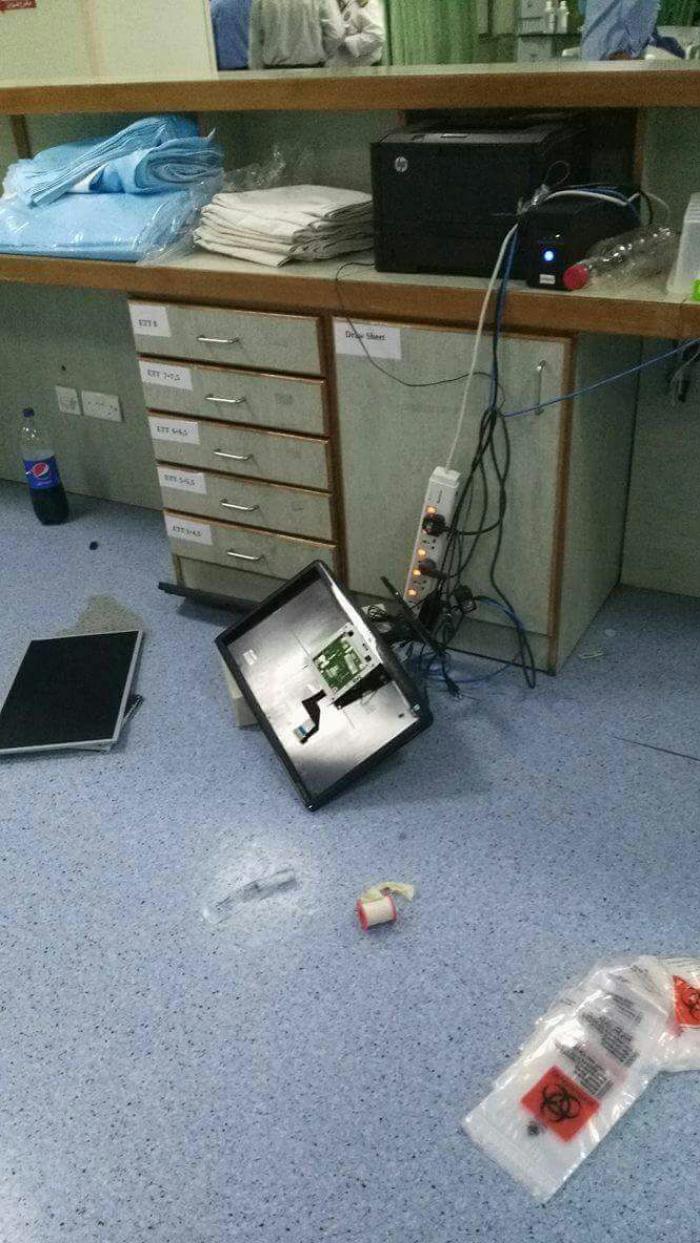وقال مصدر امني بأن مجموعة من اقارب متوفى ستيني، قاموا بتحطيم واجهات زجاجية بالمستشفى واجهزة كمبيوتر في قسم العناية الحثيثة.