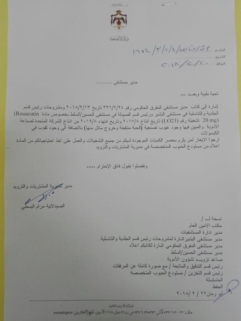 وكانت الناطق باسم المؤسسة د.هيام الدباس قالت في تصريح سابق ان قسم رصد الاثار الجانبية في مديرية الدواء في المؤسسة العامة للغذاء والدواءِ تلقى شكوى بخصوص المستحضر الدوائي وتركيبته العلمية Isotretinoin على شكل كبسولات، حيث تبن انها منتفخة ومثقوبة ويخرج منها مادة المستحضر وذلك لتشغيلة واحدة من هذا المستحضر.