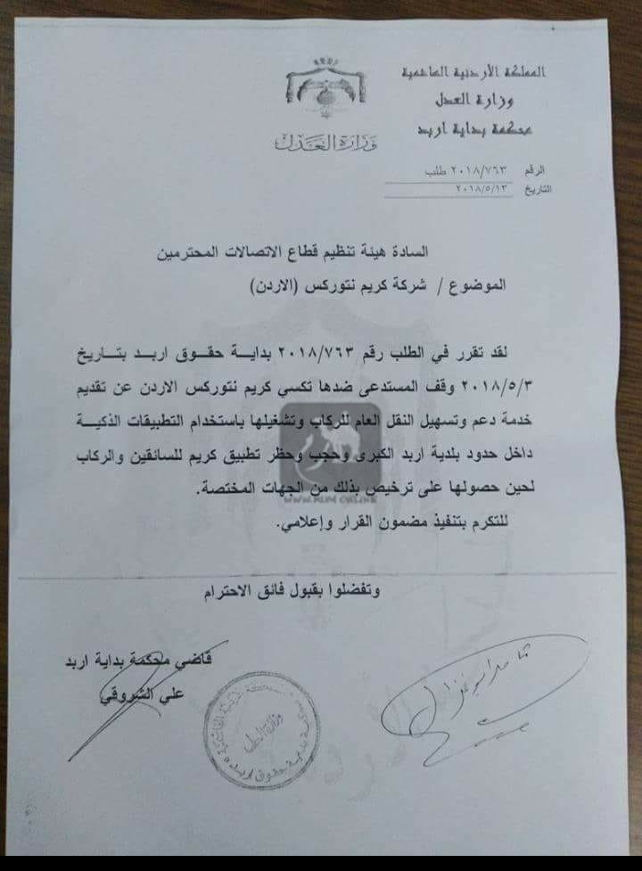 كما تضمن الكتاب الصادر عن محكمة بداية اربد بحجب وحظر تطبيق كريم للسائقين والركاب لحين حصولها على ترخيص بذلك من الجهات المختصة.