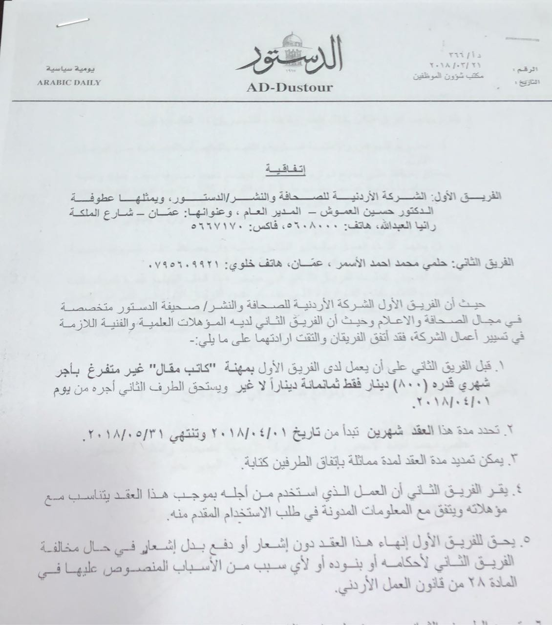 رئيس تحرير الدستور: عدم تجديد عقد الزميل الاسمر وليس منعه من الكتابه - وثيقة