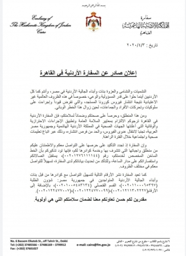 ومن هذا المنطلق، وحرصاً على صحتكم وضماناً لسلامتكم، فإن السفارة الأردنية في القاهرة ترجوكم الالتزام بمعايير السلامة العامة وتطبيق الإجراءات الاحترازية والوقائية التي أعلنتها الجهات الصحية في المملكة الأردنية الهاشمية وجمهورية مصر العربية، تجنبا لانتقال عدوى الفيروس، والحد من فرص انتشاره، وذلك عبر اتباع تعليمات صحية واجتماعية خلال الفترة الراهنة.