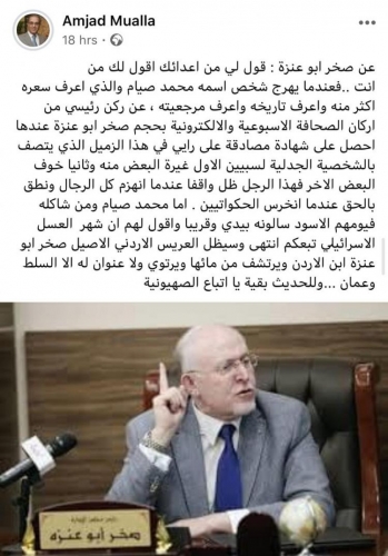 اما محمد صيام ومن شاكله فيومهم الاسود سالونه بيدي وقريبا واقول لهم 'ان شهر العسل الإسرائيلي تبعكم انتهى وسيظل العريس الاردني الاصيل صخر ابو عنزة ابن الاردن ويرتشف من مائها ويرتوي ولا عنوان له الا السلط وعمان ...وللحديث بقية يا اتباع الصهيونية ..