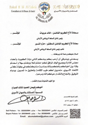 رحب المستشار في الديوان الاميري الكويتي فيصل الحمود المالك الصباح برئيس نادي السلط خالد عربيات، ونائب الرئيس حازم النسور، وأعضاء مجلس الإدارة وبجميع الوفد المرافق المشاركين في بطولة الاتحاد الاسيوي في الكويت.