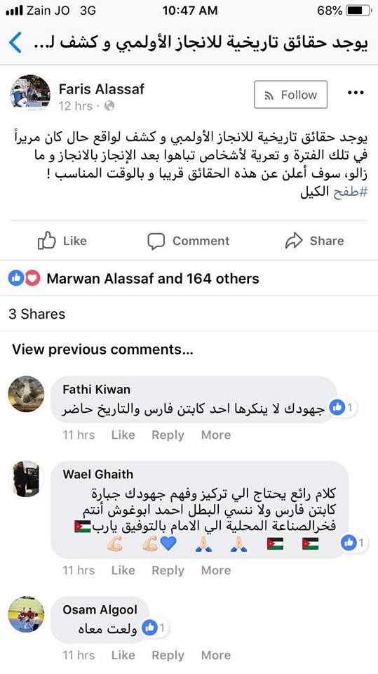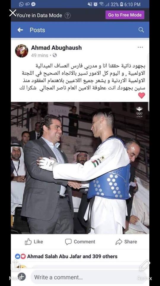 فيما علق أبو غوش على صفحته ' بجهود ذاتية حققنا أنا ومدربي فارس العساف الميدالية الذهبية , واليوم كل الأمور تسير بالاتجاه الصحيح في اللجنة الأولمبية الأردنية ويشعر جميع اللاعبين بالاهتمام المفقود منذ سنين بجهودك أنت عطوفة الأمين العام ناصر المجالي شكرا لك'.