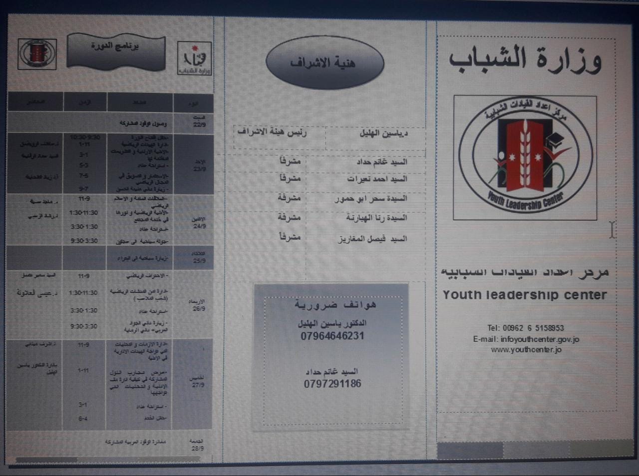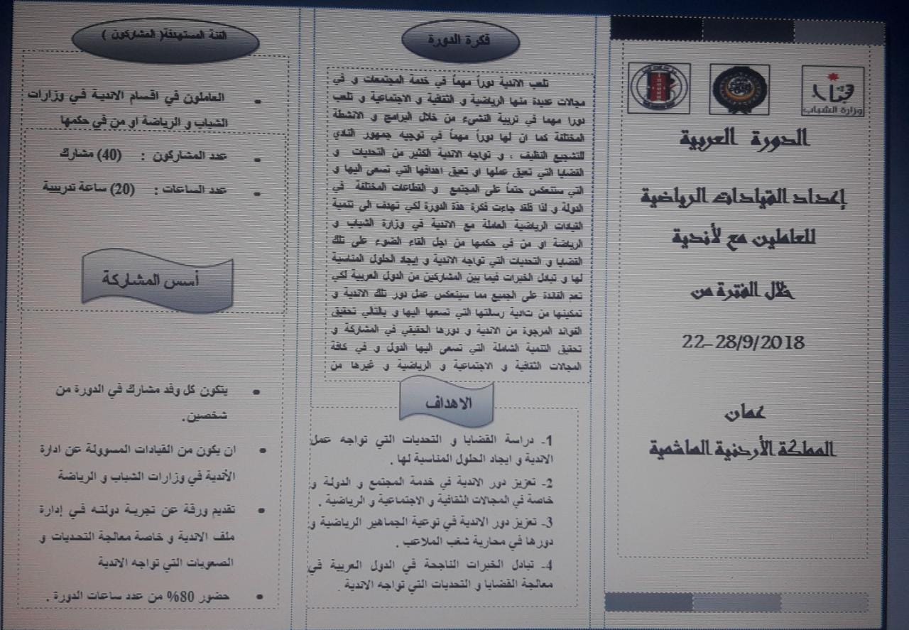 تحت رعاية وزير الشباب مكرم القيسي ينظم مركز اعداد القيادات الشبابية ممثلا بوزارة الشباب بالتعاون مع جامعة الدول العربية- اللجنة الشبابية والمكتب التنفيذي لوزراء الشباب والرياضة العرب حفل افتتاح "الدورة العربية لاعداد القيادات الرياضية للعاملين مع الاندية " . وذلك يوم الاحد المقبل 23 ايلول بحضور مندوب جامعة الدول العربية، ورئيس اللجان الوطنية الأولمبية العربية و رئيس الاتحاد العربي لمراكز اعداد القيادات.