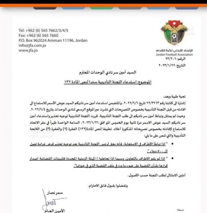 وجه الاتحاد الأردني لكرة القدم كتابا رسميا لنادي الوحدات، يطالب فيه أمين سر النادي عوض الأسمر بالتواجد في مقر الاتحاد يوم غد