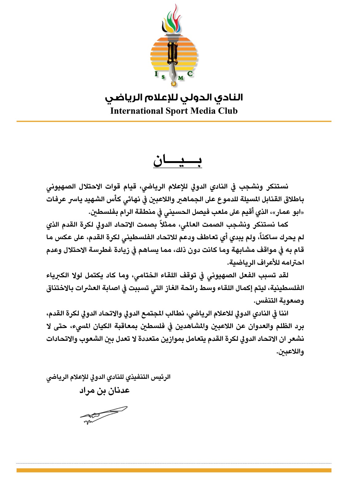 نستنكر ونشجب في النادي الدولي للإعلام الرياضي، قيام قوات الاحتلال الصهيوني باطلاق القنابل المسيلة للدموع على الجماهير واللاعبين في نهائي كأس الشهيد ياسر عرفات "ابو عمار"، الذي أقيم على ملعب فيصل الحسيني في منطقة الرام بفلسطين