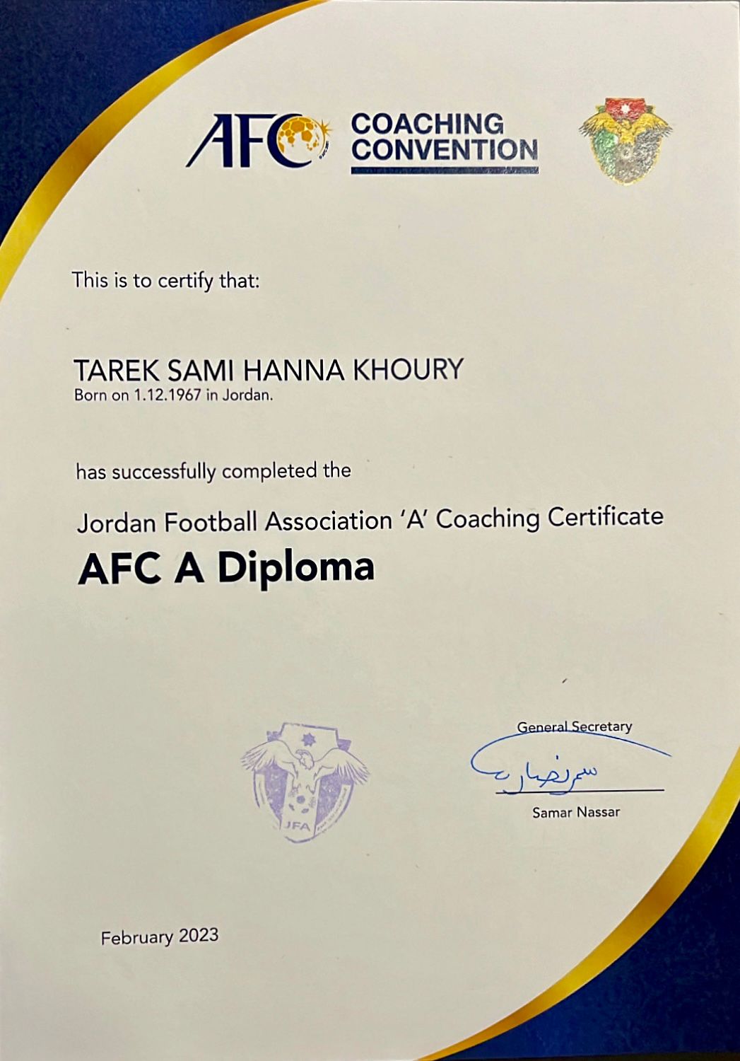 "خوري" يحصل على شهادة الاتحاد الآسيوي لتدريب كرة القدم للمستوى "A"