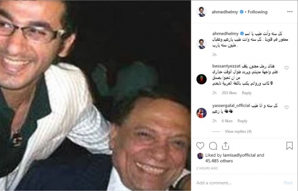 لم يترك النجم أحمد حلمى فرصة عيد ميلاد الفنان الكبير الزعيم عادل إمام دون أن يقدم له التهانى من خلال نشره لصورة تجمعه بالزعيم على حسابه الشخصى، وعلق عليها قائلا: "كل سنة وأنت طيب يا اسم محفور فى قلوبنا.. كل سنة وانت طيب يا زعيم وعقبال مليون سنة يا رب".