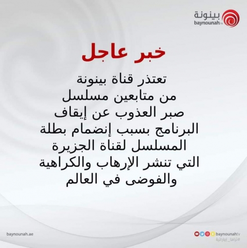 وقالت القناة في بيان لها، 'تعتذر قناة بينونة من متابعي مسلسل صبر العذوب بسبب إنضمام بطلة المسلسل لقناة الجزيرة التي تنشر الارهاب والكراهية والفوضى في العالم'.