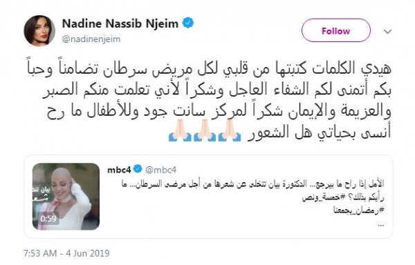 وأشارت نجيم من خلال "تويتر" أن الكلمات التي وجهتها لمرضى السّرطان، من كلماتها تضامنًا وحبًا لهم، وقالت: "لن أنسى بحياتي هذا الشعور".