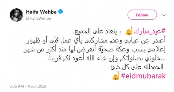 واستغلت هيفاء التغريدة التي عايدت فيها جمهورها بعيد الفطر المبارك، وكشفت عن الوعكة الصحية التي تعرضت لها قبل نحو شهر، إذ كتبت: "عيد مبارك، ينعاد على الجميع"، مضيفة: "أعتذر عن غيابي وعدم مشاركتي بأي عمل فنّي أو ظهور إعلامي بسبب وعكة صحيّة أتعرض لها منذ أكثر من شهر... خلوني بصلواتكم وإن شاء الله أعود لكم قريبًا.. الحمدلله على كل شيء".