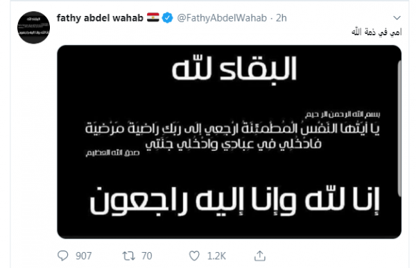 أعلن الفنان فتحى عبد الوهاب، وفاة و الدته صباح اليوم الخميس، عبر حسابه على تويتر، ولم يكشف عن أى تفاصيل أخرى.