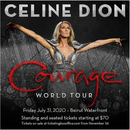 تحيى النجمة العالمية سيلين ديون، حفل غنائى فى لبنان لأول مرة فى جبيل يوم الجمعة 31 يوليو 2020، ضمن جولتها الغنائية Courage العالمية، وحجز التذاكر تبدأ من 70 دولارا.